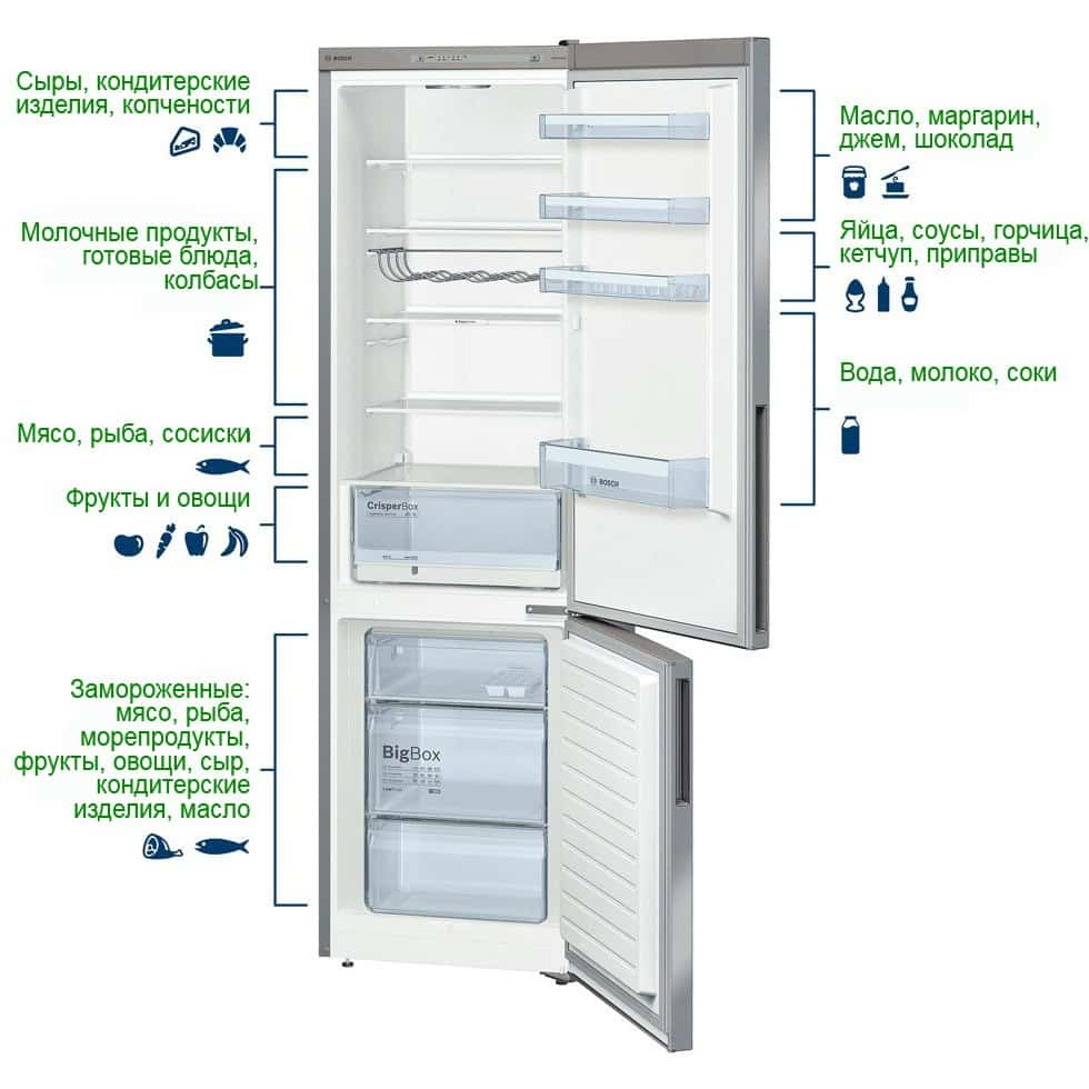 Самое теплое место в рефрижераторе это однозначно дверца. Именно здесь хранят соусы, масло, молоко, напитки – продукты, которые используются либо ежедневно и не нуждаются в долгом хранении, либо не требующие сильного охлаждения даже при длительном нахождении в холодильном устройстве.
