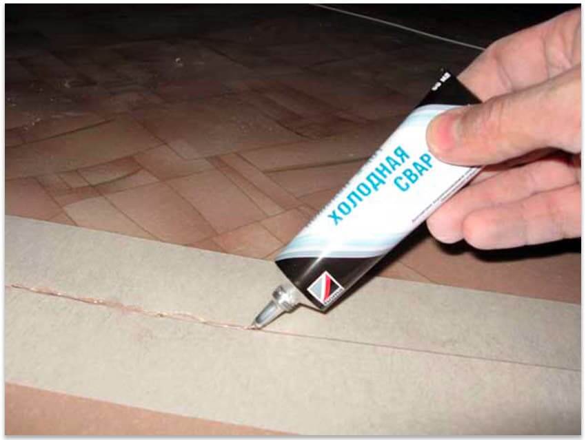 • на тубу с холодной сваркой для линолеума надевается колпачок с иглой. Игла вставляется в стык (между полосками скотча) и нажатием тубы добиваются клеевой полосы сверху по стыку (шириной 3-4 мм) – вдоль всего стыка;