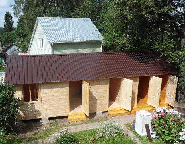 Основу подобных сооружений собирают из бруса. Внутри и снаружи она обшивается досками, ОСП либо металлопрофилем. Отличаются доступной стоимостью и надежностью, не боятся круглогодичной эксплуатации.