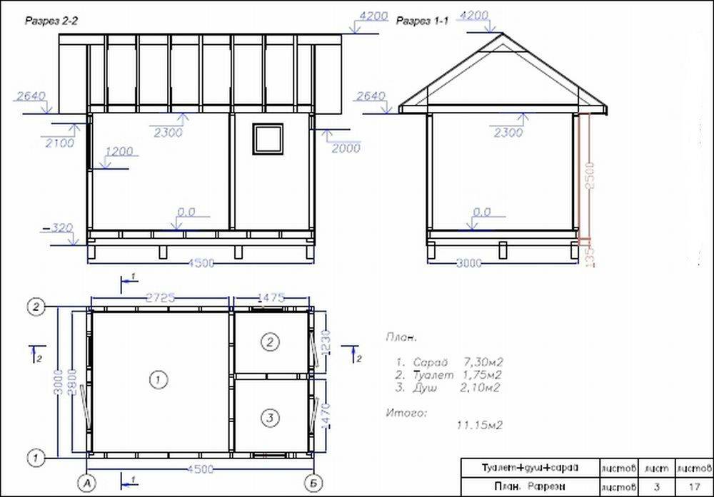 Самый дешевый сегмент подсобных помещений, где цены варьируются в пределах 11000 – 30000 р, представлен каркасными строениями небольшой площади. Так эконом-класс предполагает, как правило, голую коробку размером 1×1 м (2×1,5 или 2×2 м). В качестве обшивки используется вагонка, крыша застилается ондулином или рубероидом.
