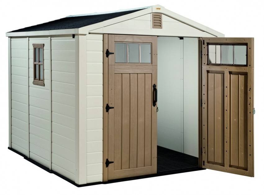 Пластиковый. Из плюсов стоит отметить то, что для него не нужен фундамент, его легко транспортировать до дачи и он прост в сборке. В нем есть пол, вентиляция и окна. Благодаря этому, внутри сухо и светло. А также пластик не требует особого ухода, он не гниет, и долго будет иметь аккуратный и привлекательный вид.