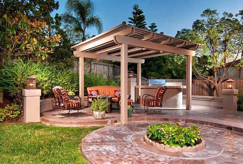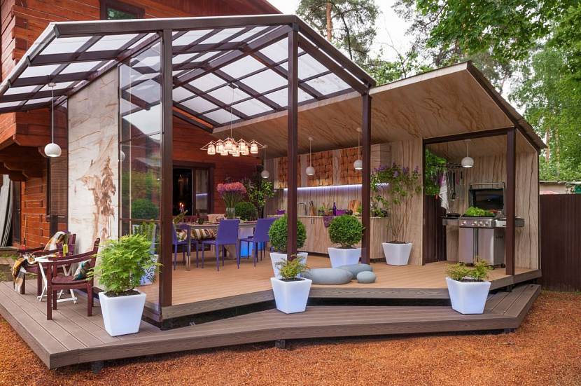 Зону отдыха можно сделать примыкающей к дому. Это террасы, которые изготавливают из дерева или достраивают ее столбы из кирпича. При этом пол может быть земляным, из досок или наливной бетонный, задекорированный камнем или плитами.