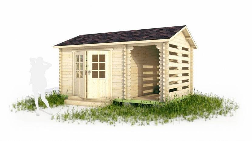 Второй вариант – бытовка с террасой и дровником. В данном случае, помимо открытой пристройки для хранения дров, также добавляют с другой стороны террасу для отдыха. Такое строение тоже можно отнести к временному, где терраса, дровник и хозблок располагают под одной крышей, приблизительно как на фото ниже.
