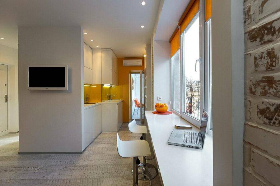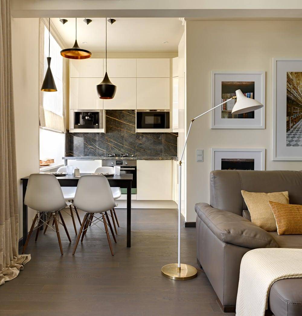 Отсутствие перегородок. В таких квартирах кухня от главной комнаты зачастую отделяется барной стойкой или обеденным столиком. Открытость позволит визуально расширить пространство и сделать комнату светлее. Красиво смотрятся стойки, плавно переходящие в кирпичную кладку стены. Благодаря такому дизайнерскому ходу создается единый стиль. А уместным дополнением к небольшому столику из стекла или металла станут деревянные стульчики, складные табуреты или барные стулья.