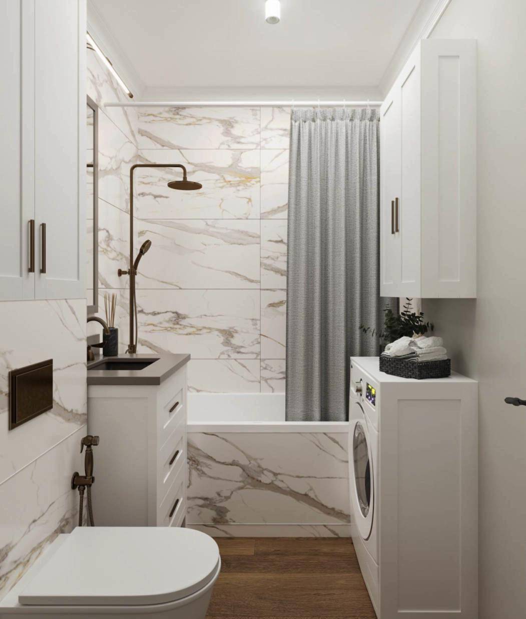Нельзя забывать и о технической оснастке, ведь ванную комнату современной квартиры невозможно представить без стиральной машинки. Относительно отделки стен, то для нее подберите кафель светлых тонов под мрамор или другой натуральный камень. В качестве напольного покрытия используйте плитку или гранит.