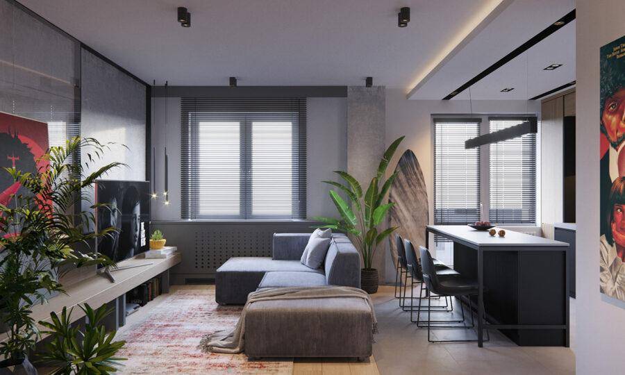В процессе перепланировки санузел отделили от гостиной функциональной перегородкой с нишами-полками. Черная графитовая стена стала акцентом, который определяет настроение всего интерьера. Перегородка частично зонирует и пространство кухни. Несмотря на компактность последней, места для приготовления еды достаточно. Шкафчики дополняют открытые стеллажи, на которых выставлена посуда.