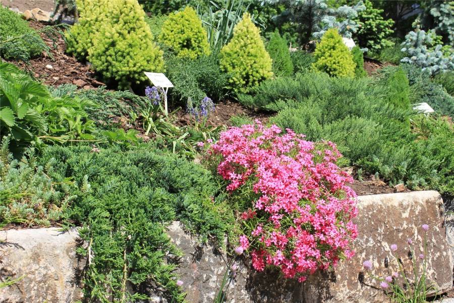 Хвойные растения отлично сочетаются с лиственными растениями и цветами