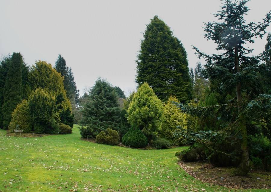 чтобы композиция их хвойников (как деревьев, так и кустарников) смотрелась гармонично и целостно, место для наилучшего обзора (расположение беседки или смотровой площадки) должно располагаться на расстоянии не меньшем, чем 2 длины композиции