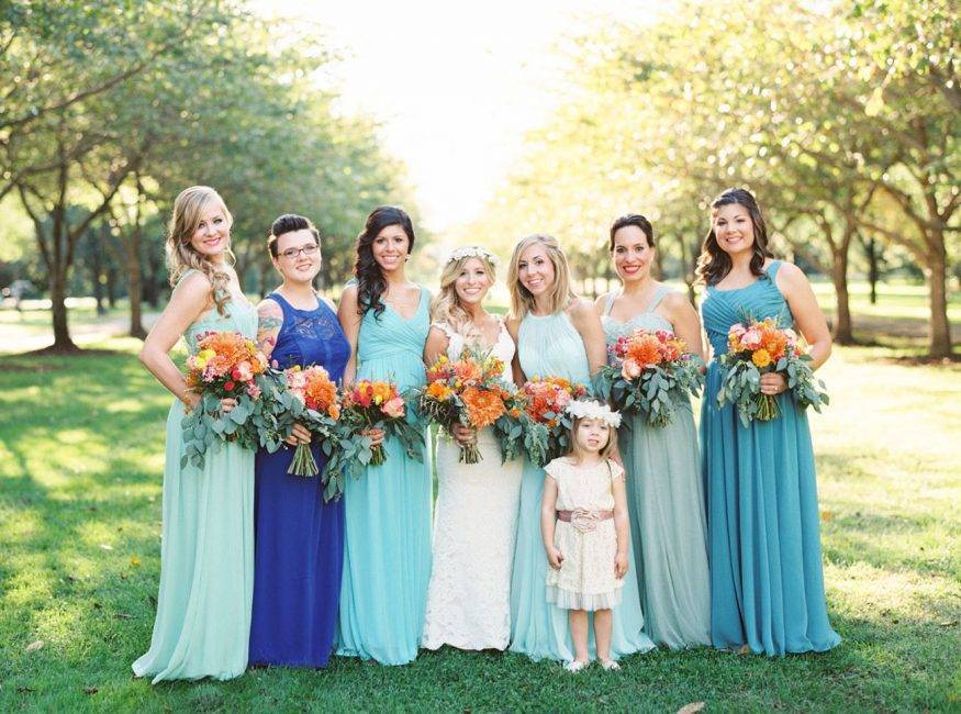 Можно предложить одеть подружкам платья, а друзьям жениха рубашки одного цвета. Или же, если пара не желает настаивать на форме одежды, можно подготовить для всех одинаковые бутоньерки, что так же выделит близких друзей из общей массы.