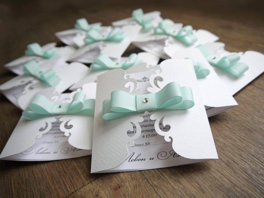 Такой цвет сделает пригласительные нежными, легкими, мятный хорошо будет смотреться с пастельными тонами. Оригинально обыграть конверты можно перевязав их лентой соответствующего цвета, или любые другие вспомогательные элементы, например, конфетти, декоративные прищепки и все, что подскажет фантазия.