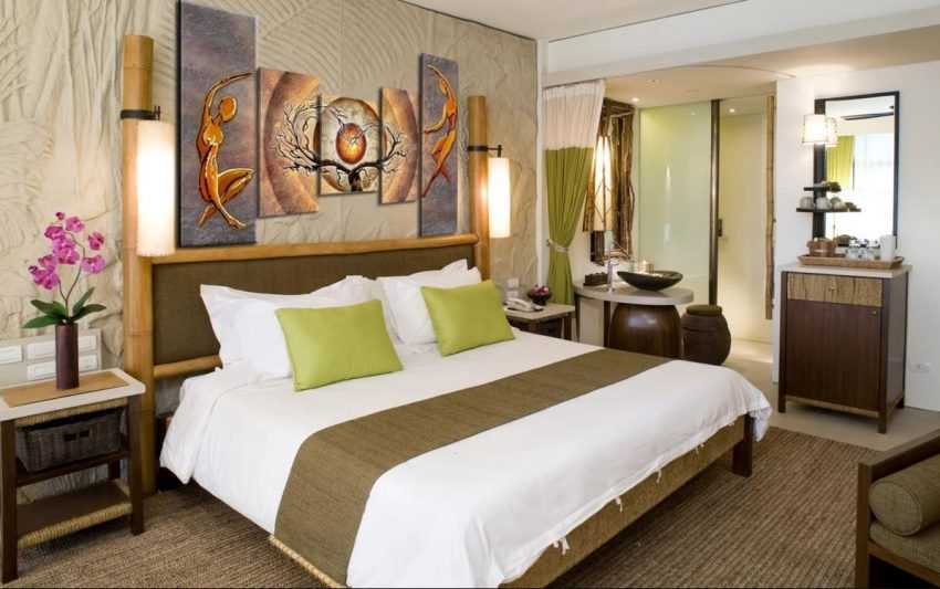 Дизайн над кроватью в спальне по фен-шуй предполагает использование картин с нейтральным мягким сюжетом, наполняющих душу спокойствием, или изображениями цветов, символизирующих удачу и благополучие. Изображения острых колющих предметов в спальне желательно избегать.