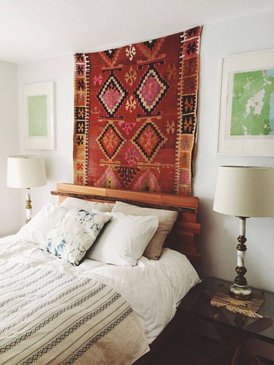 В дизайне над кроватью в спальне довольно часто можно встретить ковры или коврики. Это очень давнее и во многом уместное декорирование до сих пор актуально у почитателей фьюжна и эклектики. Красочный роскошный ковер прекрасное украшение комнаты.