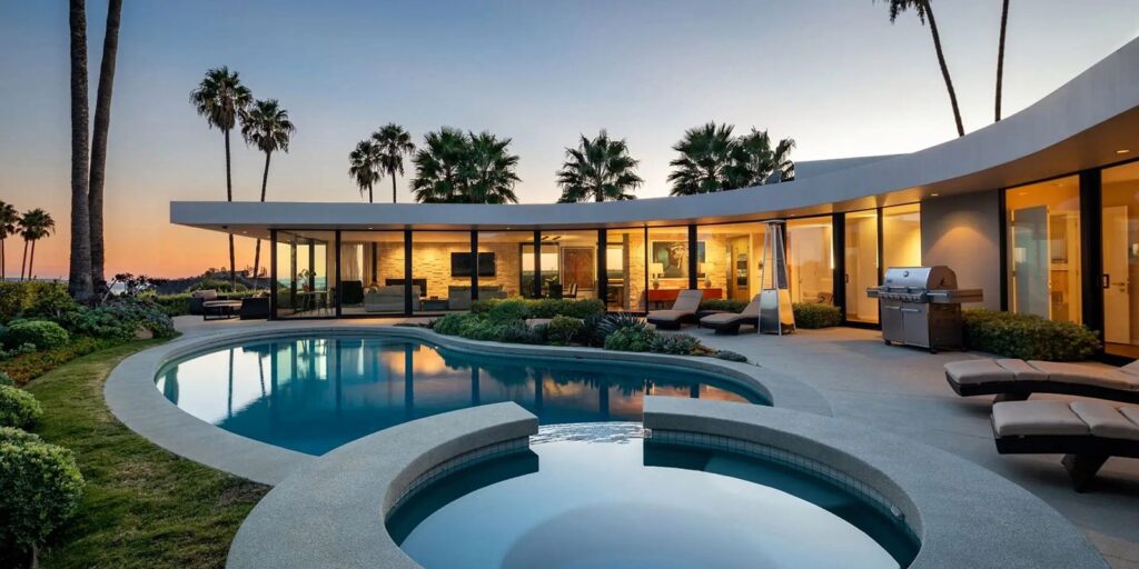 Интерьер комнат в доме оформлен в стиле модерн. На территории дома также имеется небольшой бассейн и зона для отдыха.