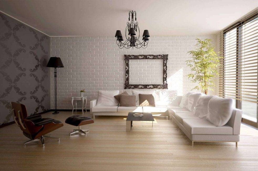 - Имитация кирпича из декоративной штукатурки в интерьере гостиной.