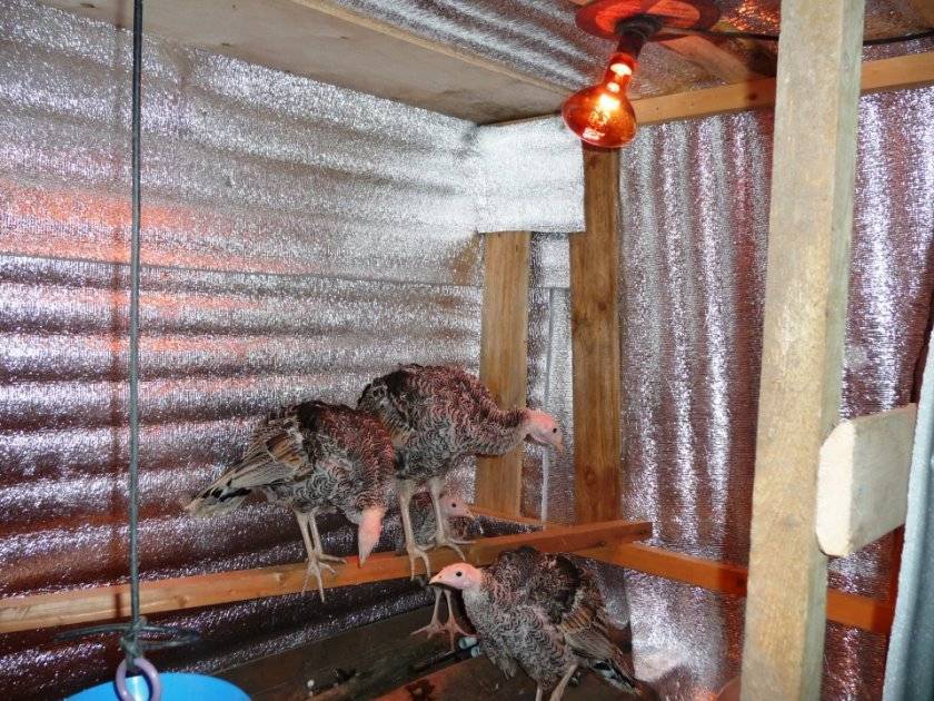 В первую неделю после рождения индюшат размещают в брудер. Лампа внутри него будет обеспечивать нужную температуру воздуха и освещение. На полу укладывают подстилку из песка, размещают мягкие кормушки и поилку. Эти приспособления не должны быть непосредственно под лампой, их лучше разместить недалеко от центра. Подстилку нужно регулярно менять. Со второй недели в качестве подстилки можно использовать ошпаренные опилки. Менять их нужно не менее 1 раза в неделю. Плотность размещения индюшат – 5 шт. на 1 кв.м.