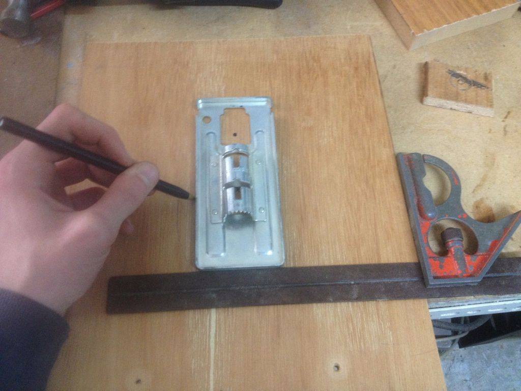 - В центральной части фанерной крышки отметьте место, где будете закреплять подошву лобзика, и отверстие для полотна лобзика.