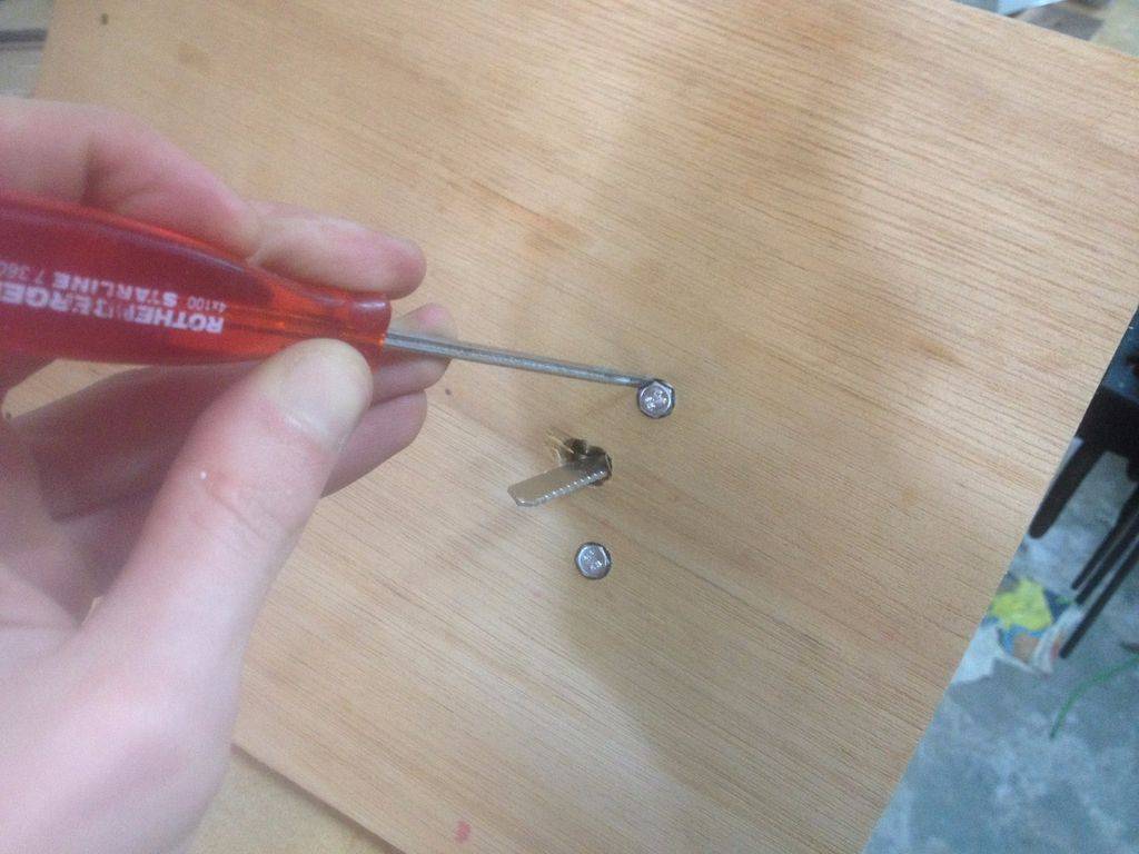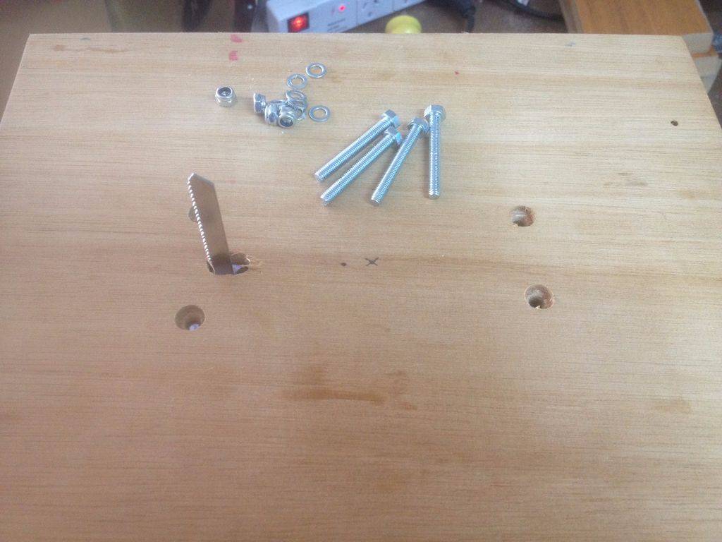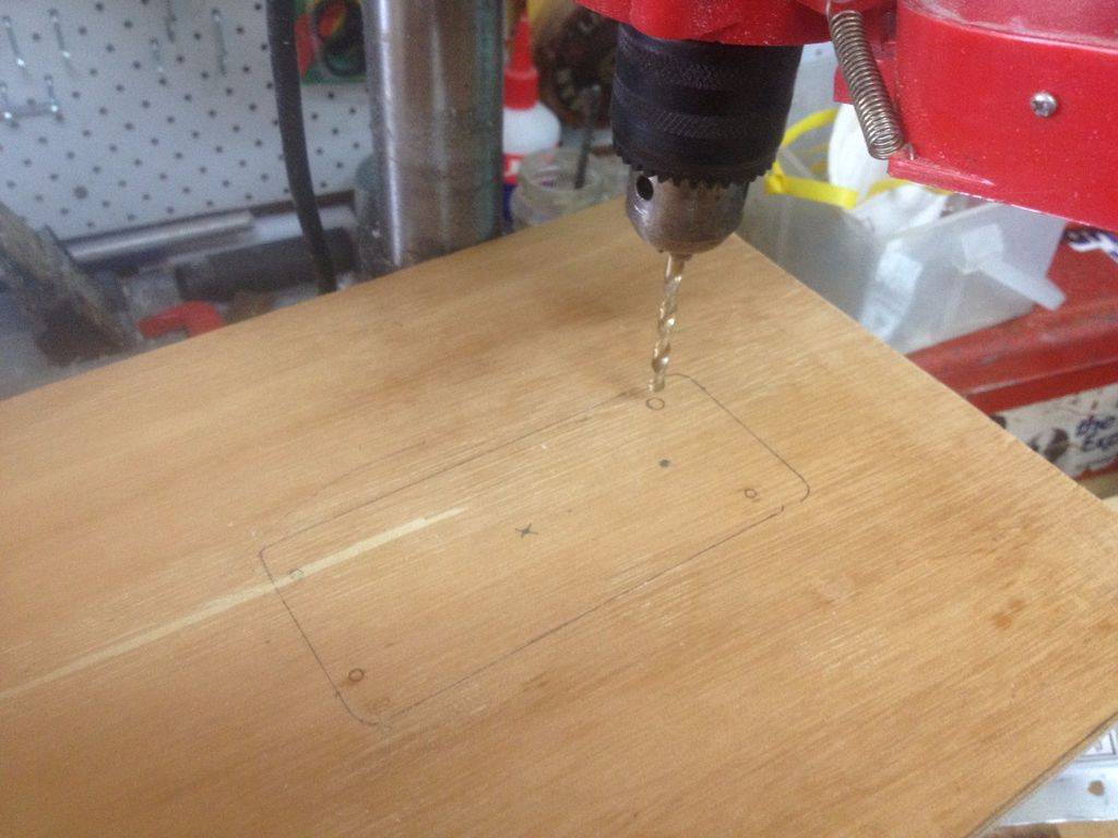 - Теперь можно просверлить четыре отверстия в фанере, раззенковав их перовым сверлом, чтобы шляпки винтов были вровень с поверхностью. Осталось сделать отверстие под пилку.