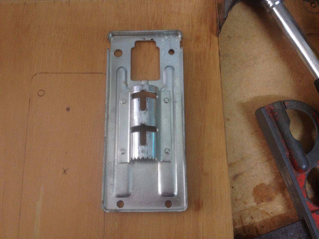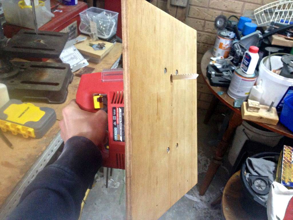 - Теперь наденьте подошву обратно на лыжи лобзика, и приложите фанерную крышку к подошве, чтобы пилка прошла в предназначенное для нее отверстие.