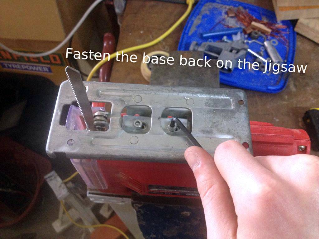 - Снимите подошву с лобзика, с помощью идущего в комплекте шестигранника. В крышке уже есть одно отверстие, вам осталось просверлить еще три, чтобы в каждом углу было монтажное отверстие.