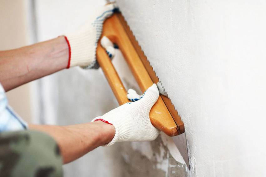 - Для начала следует избавиться от крупных дефектов на стене – зачастую это крупные цементные протечки, которые возникают вследствие неправильной кладки кирпича, пеноблоков и прочих строительных материалов. Если на стенах имеется краска или декоративная штукатурка, ее необходимо сбить.