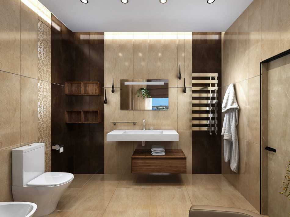 Проект квартиры предусматривает небольшую ванную комнату. Увеличить визуальное восприятие помогут светлые цвета плитки. Она может иметь плавный градиент снизу, который меняется в самом верху.