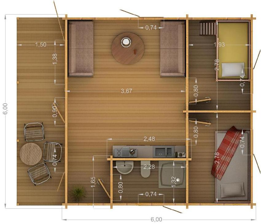 - ✓ Разделите дом на спальню, гостиную и кухню. Не надо перегружать пространство мебелью. На кухне хватит стола, плиты, табуретов и холодильника. В гостиной – дивана и телевизора, в спальне – кровати с небольшим комодом для хранения вещей.