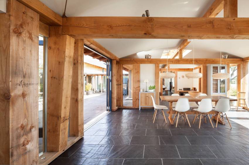 В оформлении дома использована натуральная древесина и современные отделочные материалы