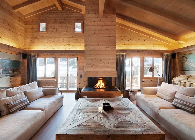Ключевым интерьерным элементом может стать камин с расположением вдоль стенки или по центру помещения. Очаг в основном облицовывают природным камнем, гармонично сочетающимся с брусом. Для отделки пола используется матовые или полуматовые доски с эффектом состаривания.