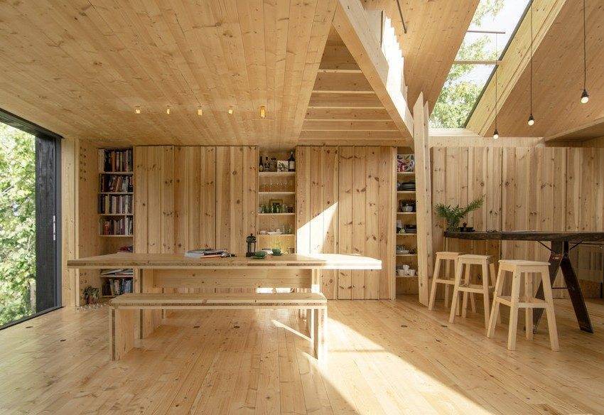 Интерьер с обилием деревянных материалов и декоративных элементов