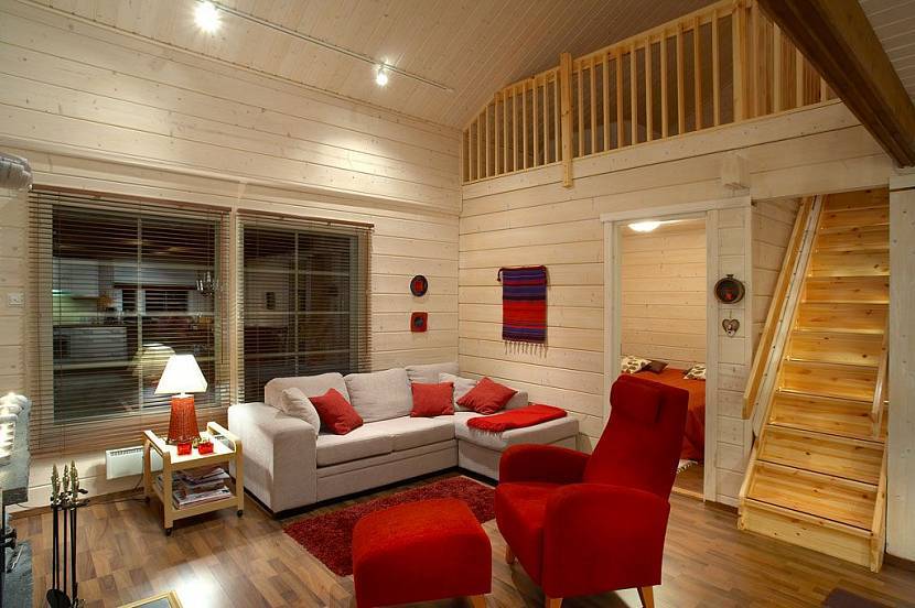 В интерьере дома из клееного бруса преобладают светлые оттенки
