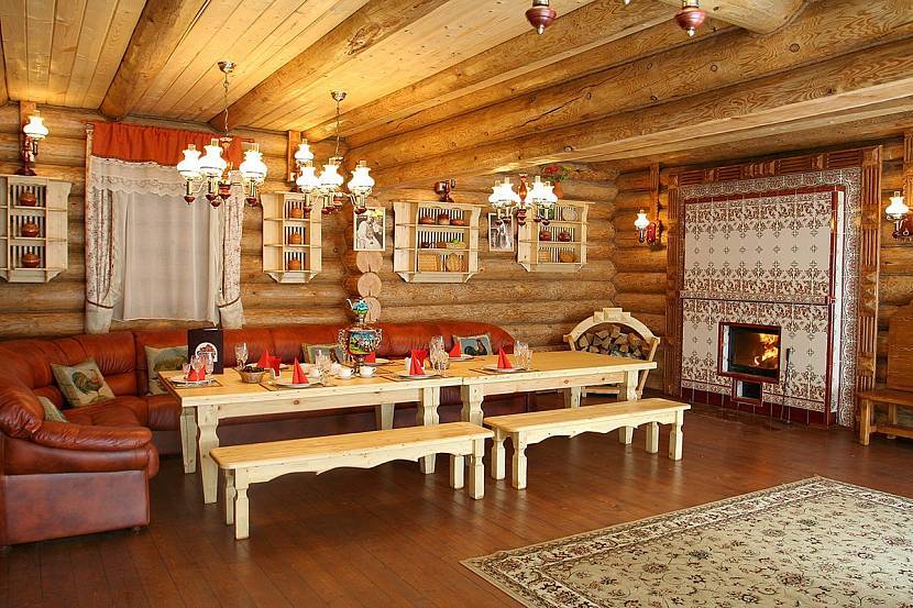 При оформлении внутреннего убранства таких усадеб, главной целью является максимальное удобство и функциональность. Каждый предмет в таком доме выполняет какую-либо важную функцию. Обязательным элементом дизайна любой традиционной русской избы является печь. В современных коттеджах этого стиля дизайнеры устанавливают камины, стилизованные под печь.