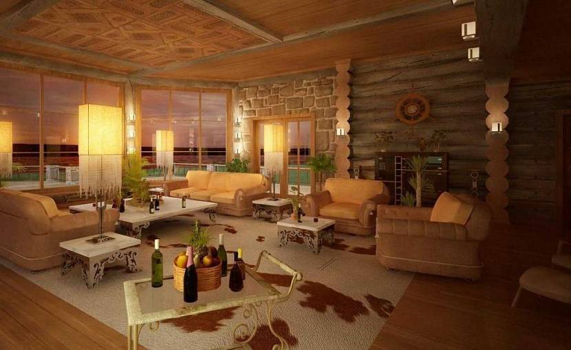 Для оформления пространства используют натуральные материалы, поэтому дизайн считается одним из самых дорогих. Фактурное сырье применяют при отделке пола, стен и потолка. Приветствуются теплые древесные оттенки, особенно состаренные варианты. Печь или стилизованный камин часто устанавливают в гостиной в деревянном доме. Поверхность декорируют изразцами, кирпичом или штукатуркой под побелку.
