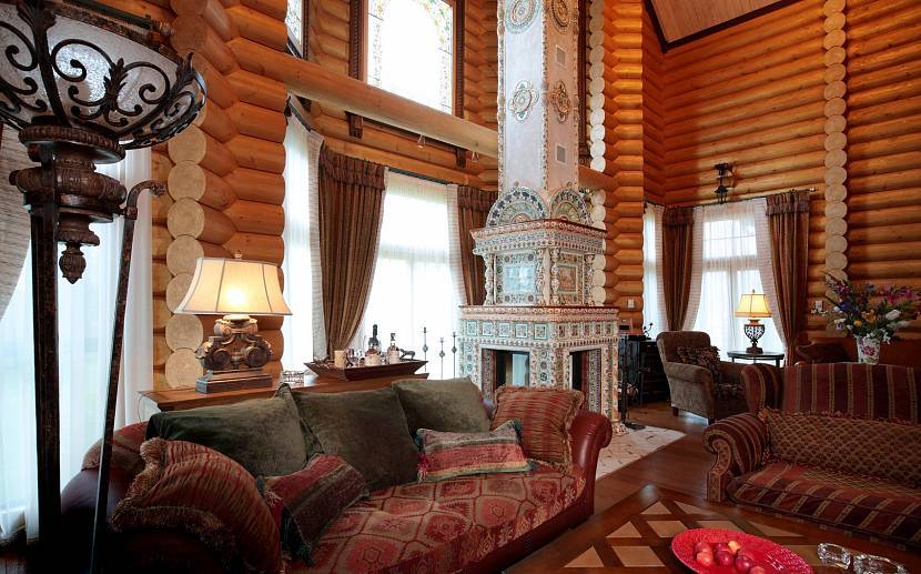 В данном стиле используется деревянная резная мебель, дорогие ткани. Центральное место в таком интерьере занимает печь, украшенная изразцами. Полы в таких усадьбах оставляют деревянными и покрывают самоткаными яркими дорожками и ковриками.
