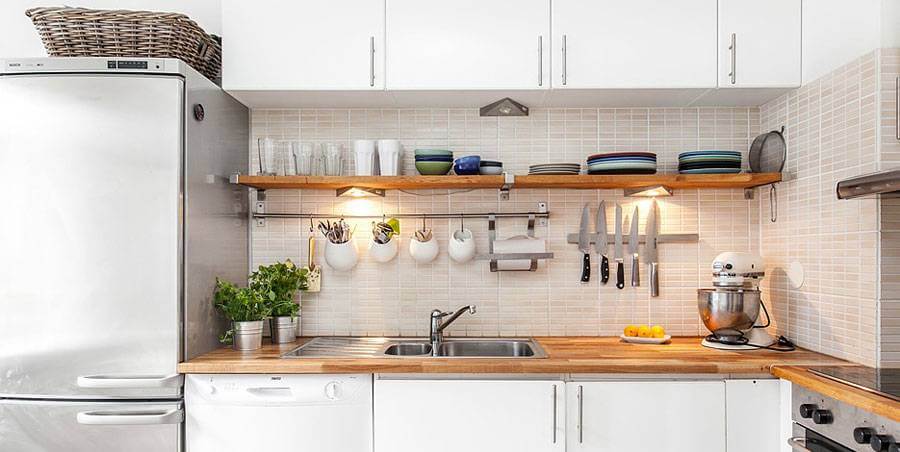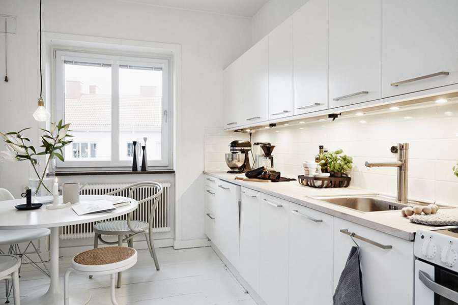 Светлый и просторный скандинавский интерьер отлично подойдет для малогабаритной кухни. Зрительно расширить ее площадь и добавить света помогут белые стены и лаконичная мебель четких форм. Натуральные природные материалы и фактуры сделают комнату комфортной и внесут в нее домашний уют.