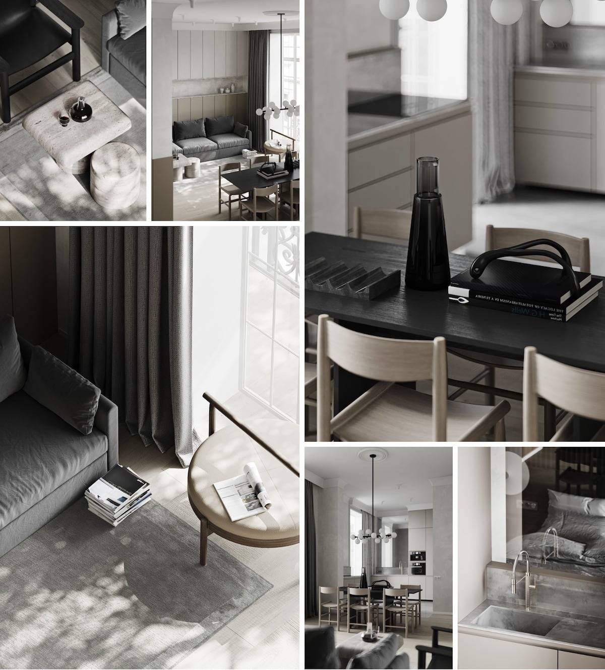 - Чрезвычайно моден вариант отделки только ахроматичными тонами, то есть – несколько оттенков серого, чёрный и белый. Вариации серого должны быть либо все тёплые, либо все холодные, всё зависит от стилистики.