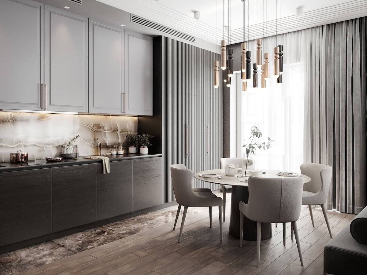 Еще одна интересная идея — сочетание белого и серого. Аксессуары и мебель этого цвета отлично смотрятся в гостиной-кухне, где преобладающим оттенком является белый. Это великолепная комбинация для небольших пространств. На самом деле, комната может быть даже очень маленькой, но белый на стенах, а также на мебели придаст гостиной-кухне дополнительное измерение.