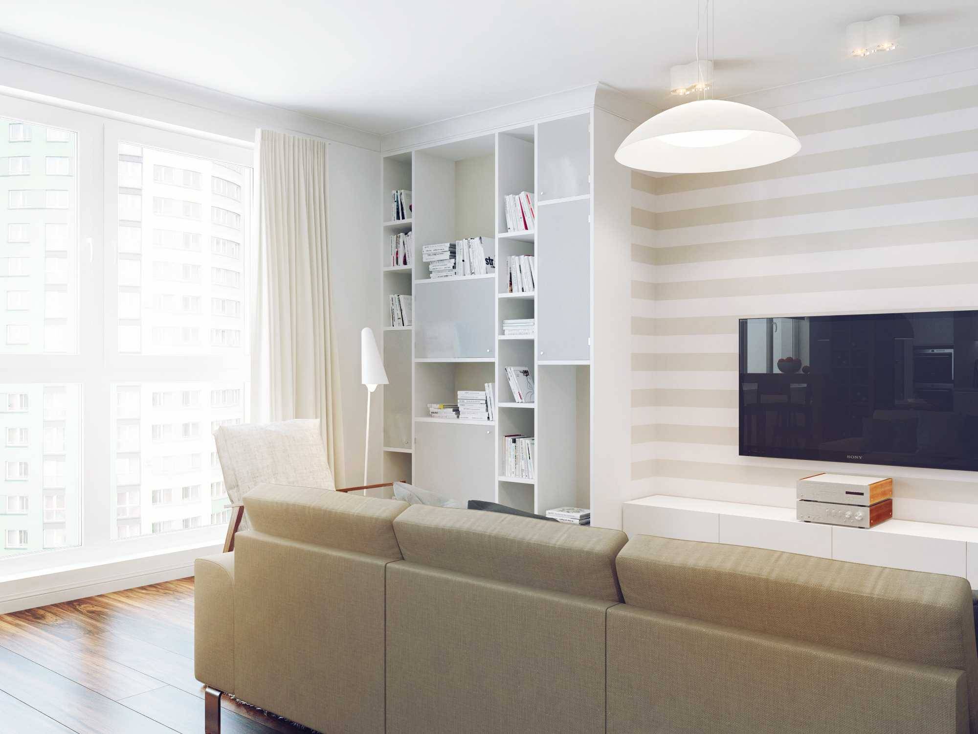 Чтобы шкафы и полки вдоль стен не сливалась с ними, она должна быть хотя бы на один-два тона темнее. Фасады могут стать дополнительным украшением гостиной в светлых тонах. Витражи или фотопечать привнесут разнообразие, разбавив однотонный дизайн.