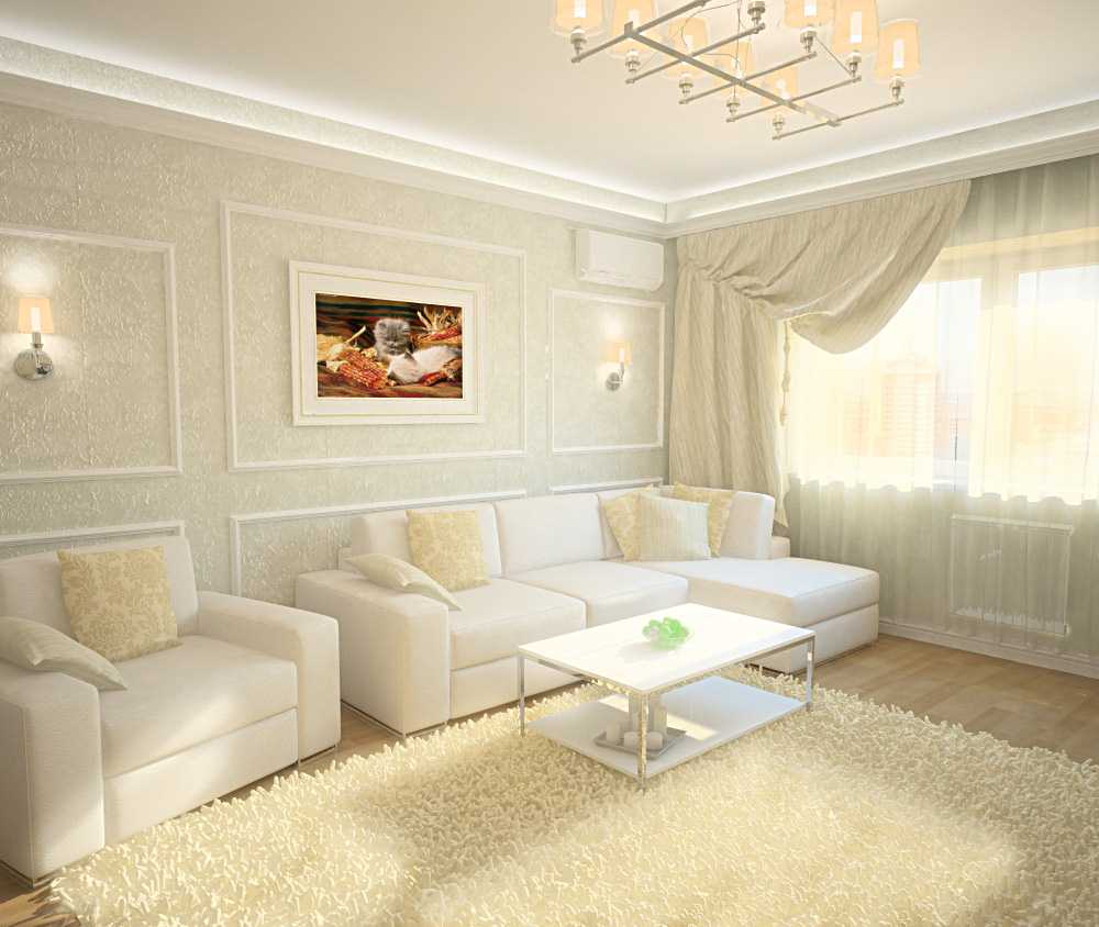 При оформлении зала в светлых оттенках для стен используют виниловые или флизелиновые обои. Универсальный отделочный материал может быть как однотонным, так и с неброским рисунком (фактурой). Дизайнеры часто выбирают рельефное сырье под покраску. В классических комнатах роскошно смотрятся интерьерные ткани и декоративная штукатурка.