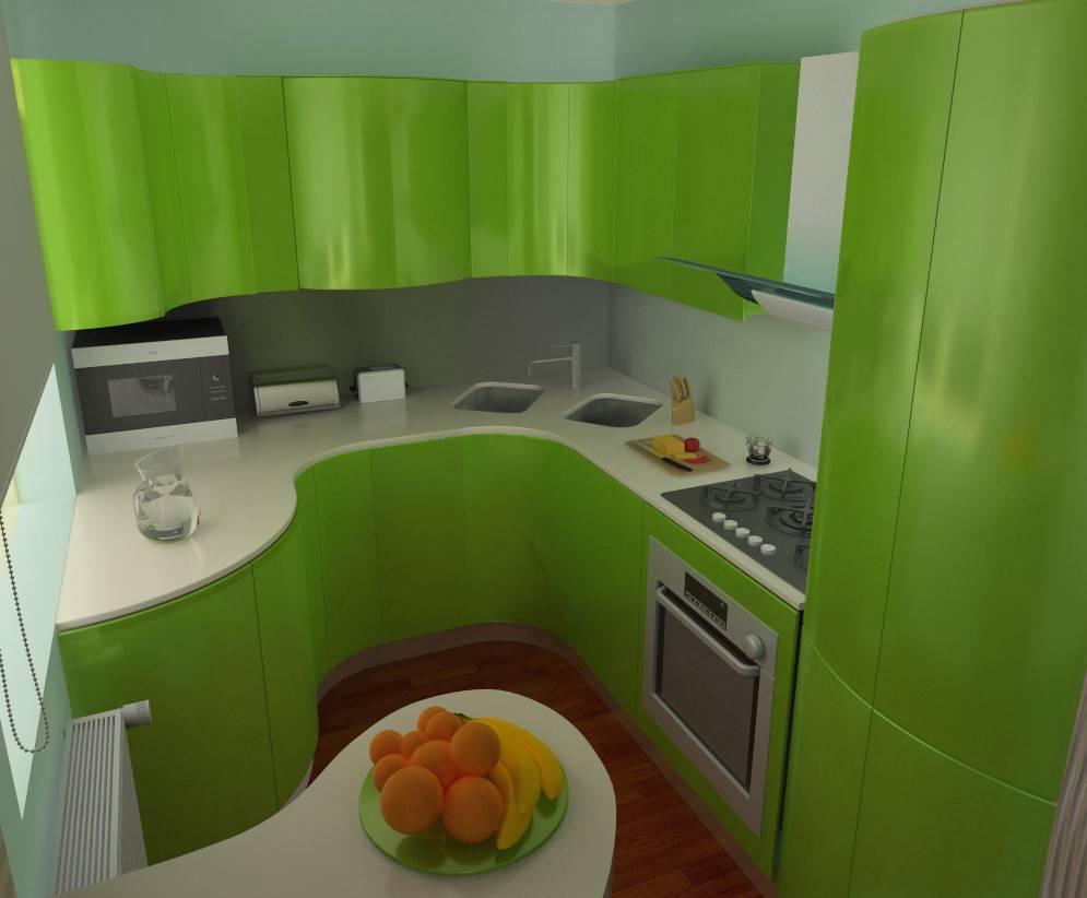Выбирайте гарнитур с глянцевыми покрытиями, стеклянными дверцами и металлическими элементами – так кухня будет казаться более просторной. Если есть возможность, вынесите холодильник в другое место. Фартук, стены и столешницы лучше выбрать светлыми, так вы сможете избежать эффекта утяжеления внутреннего убранства.