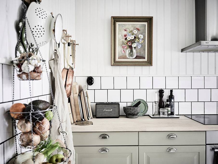 Хорошо смотрятся в такой кухне и выбеленные оттенки бежевого, серого, голубого, зеленого — все те суровые цвета, которые встречаются в природе Скандинавского полуострова. Яркие островки желтого, бирюзового, синего возможны в виде некоторых декоративных деталей, например, цветах, вазах, посуде.