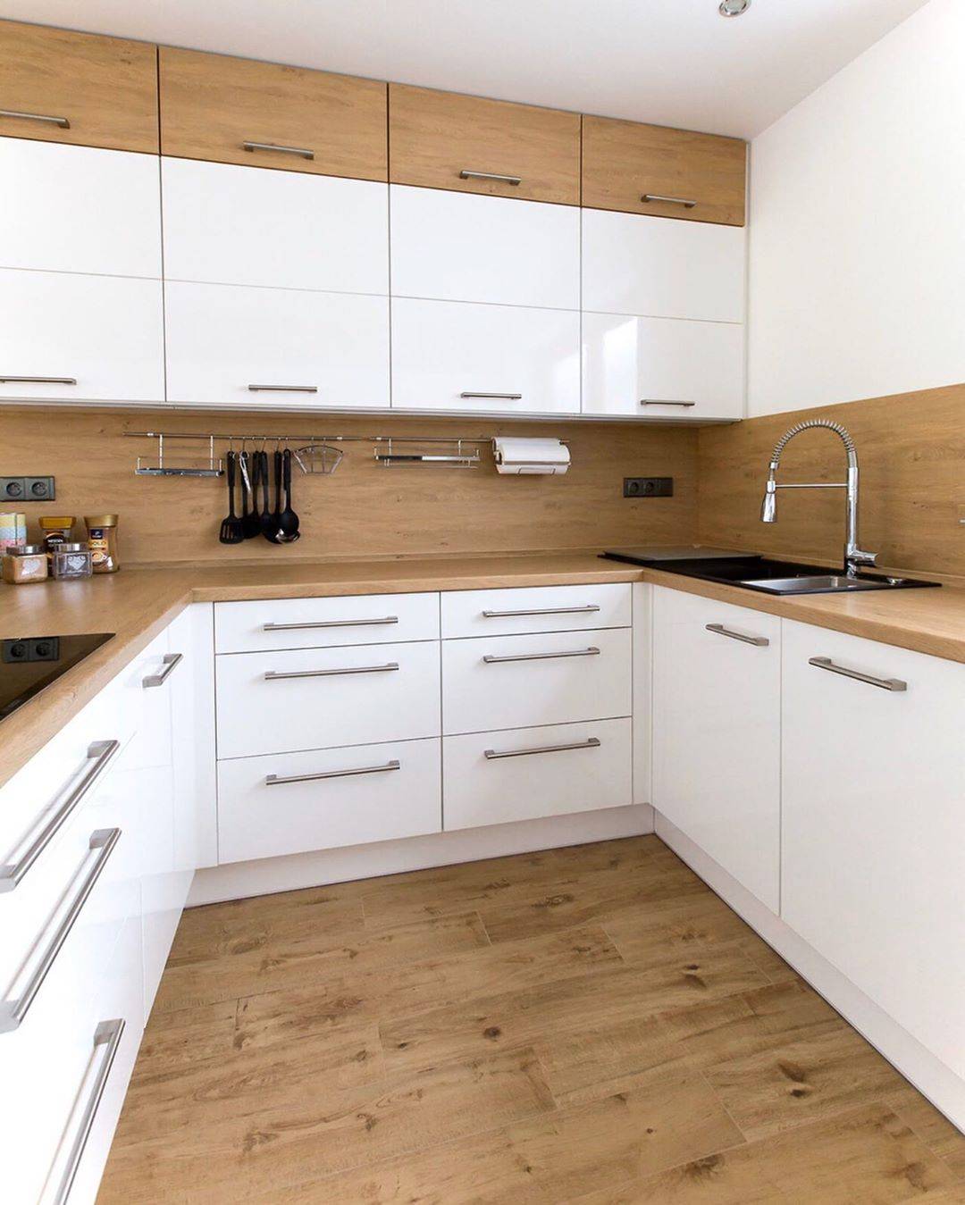 Чтобы кухня не показалась холодной и стерильной, столешницы для обеденного и рабочего стола делают из дерева натуральных оттенков в тон пола. Иногда рабочую поверхность стола и фартук оформляют в темных контрастных цветах.