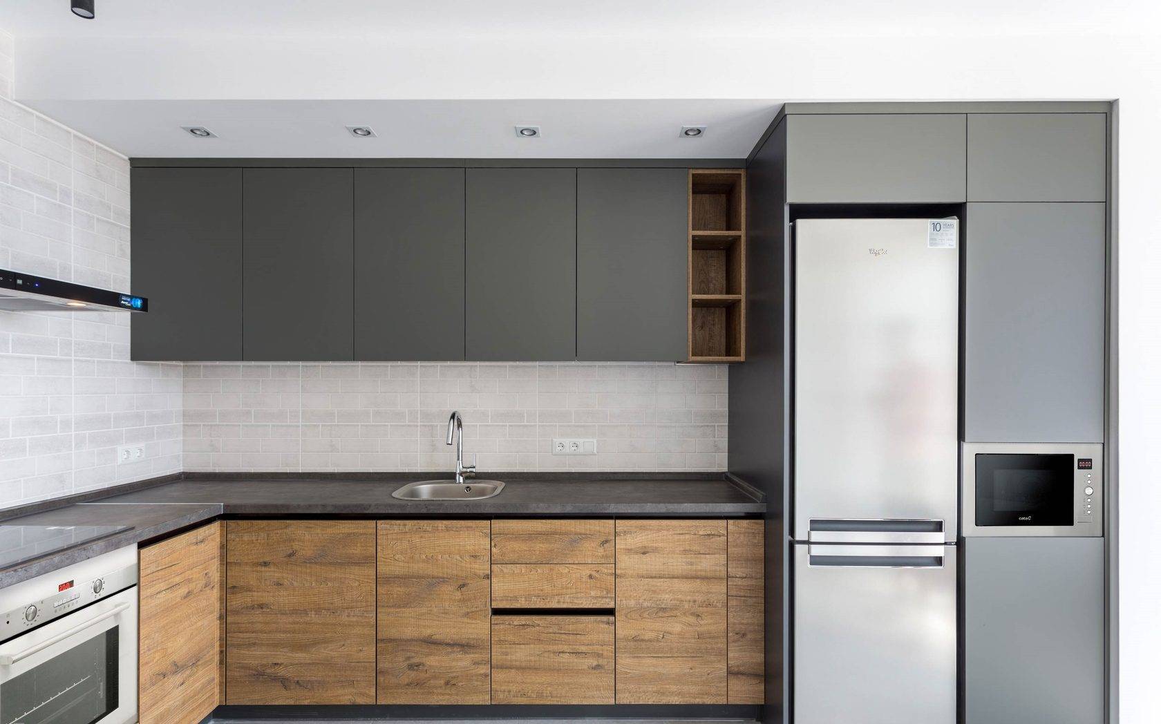 В цветовом решении кухни присутствуют оттенки серого и синего, но они не яркие, а скорее приглушенные.