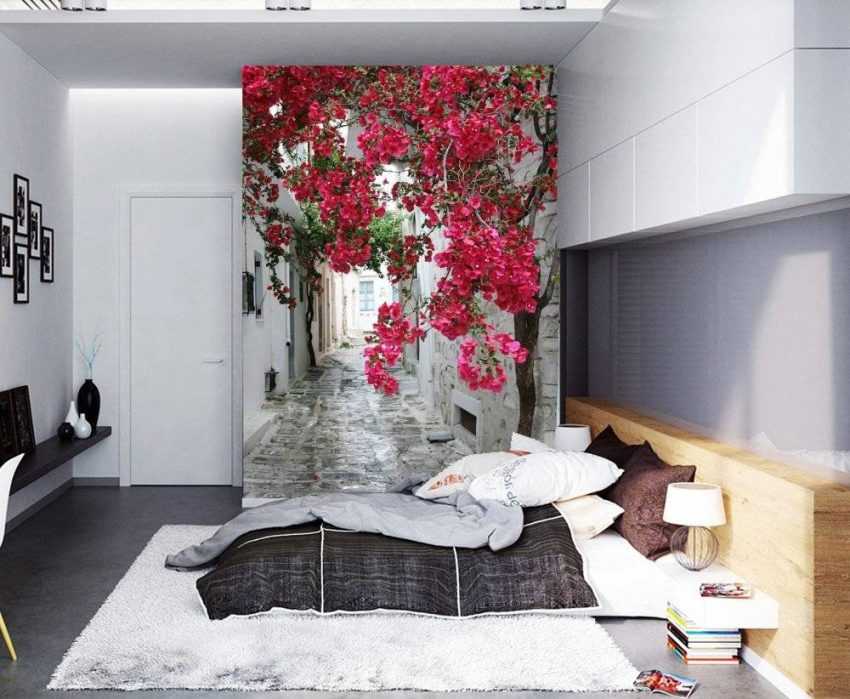 Дизайн спальни с фотообоями выглядит свежо и неизбито. Но такое декорирование стен имеет как преимущества, так и недостатки.