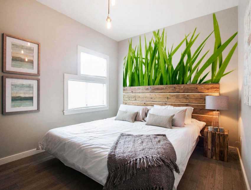 Для спальни с низким потолком актуально сочетание акцентной стены переходящей на поверхность потолка. Приветствуются сочетания объемных рисунков, стильных черно-белых орнаментов, индивидуальных принтов и фотообоев с 3-D изображений, акцентных вставок с багетом, одноцветных полотен с фактурными узорами.