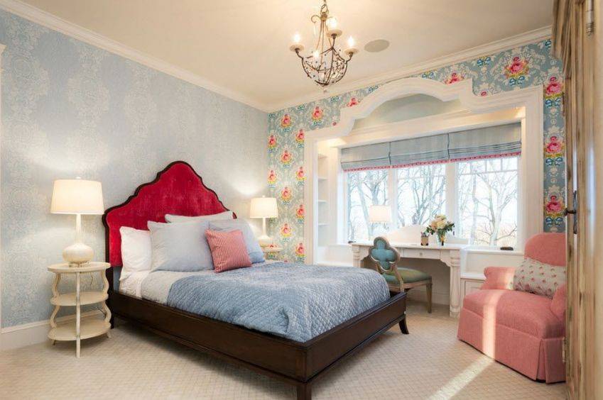 - с целью акцентирования зону кровати у изголовья нужно оклеить материалами одного типа, а для остального помещения подбирают другой тип материала;