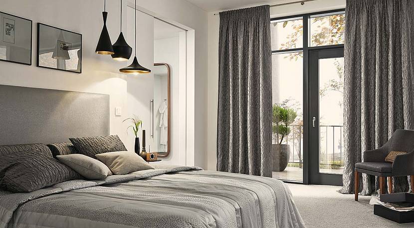 Текстильные принадлежности – покрывала, накидки и шторы часто используют в затемненном сером оттенке. Также они могут быть яркого теплого тона: розовые, сиреневые, лиловые. В оформлении окна участвуют тюли, римские или рулонные шторы, ночные портьеры. Навешиваются такие модели по-разному в виде ламбрекенов, подшитых или подвернутых краев, а также традиционными глубокими волнами.