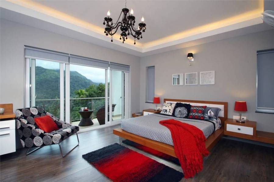 Именно красные аксессуары “спасают” серую (во всех отношениях) спальню
