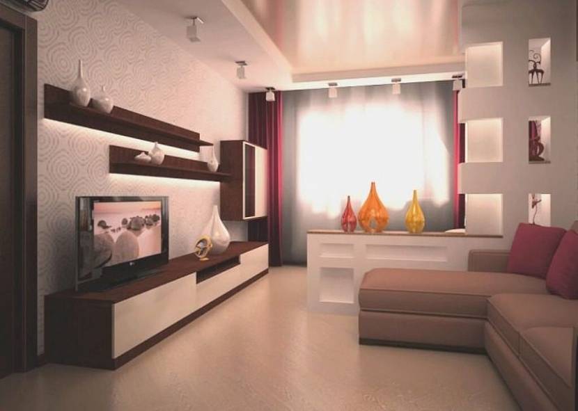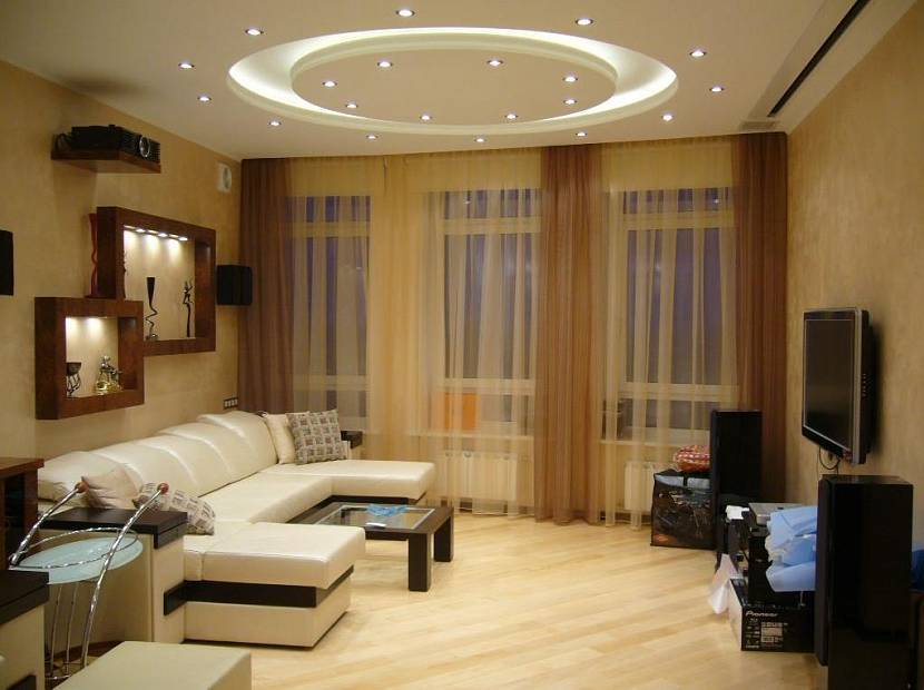 Интерьер гостиной хорошо сочетает в себе полки, ниши, гипсокартонные конструкции.