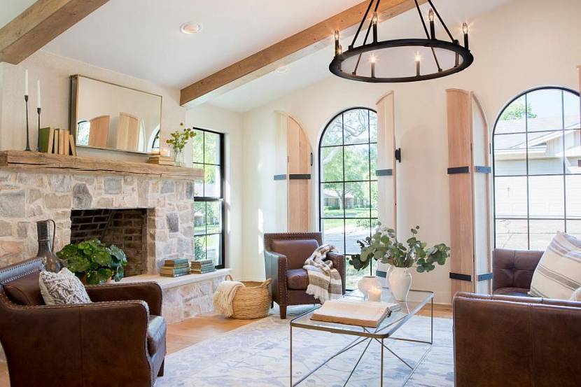Открытые балки в комнате с каминомИсточник hgtv.com