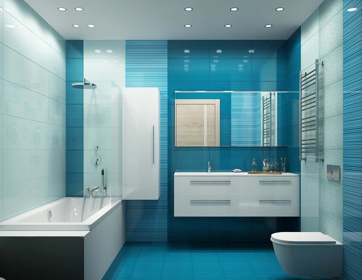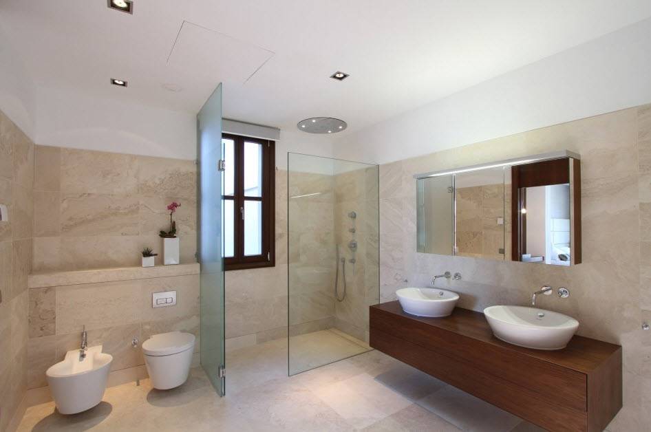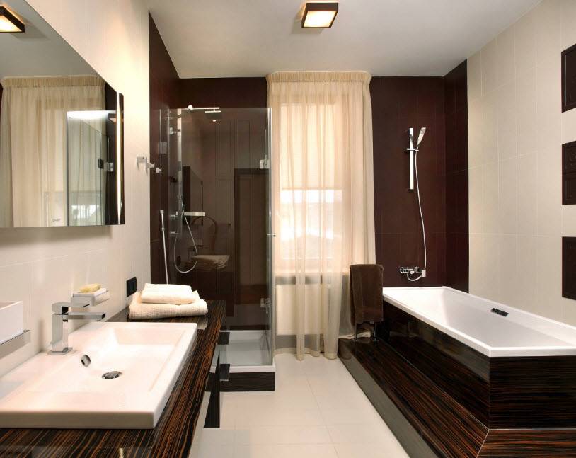 Для визуального увеличения пространства используют глянцевые поверхности, светлые и пастельные тона. Если ванная большая, то здесь можно экспериментировать, сочетая между собой оттенки и фактуры, мебель и декоративные элементы.